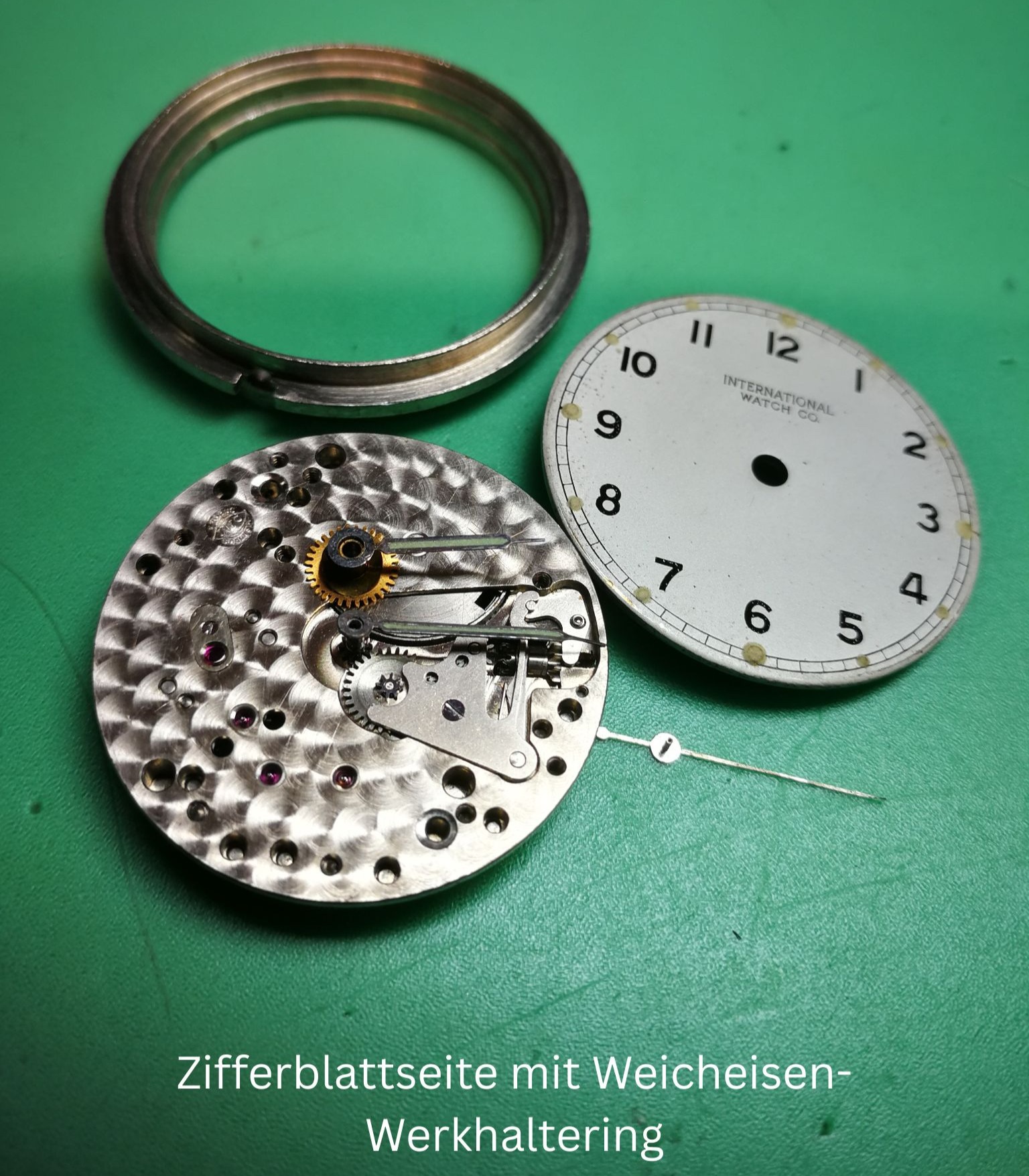 Zum Ersatz der Unruhwelle finden Sie im vorigen Beispiel einige Bilder mehr. Die Besonderheiten der IWC sind beispielsweise die aufgebogene Breguet-Spirale sowie die hochwertige Verarbeitung und Qualität der Bestandteile. Auch unter dem Zifferblatt ist die Hauptplatine perliert. Durch die Qualität der Stähle und regelmäßige Wartung sind alle Zapfen der Räder noch nicht eingelaufen und mussten nicht nachgearbeitet werden.