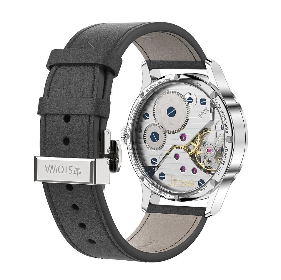Neben der abgebildeten Variante mit Handaufzug bietet Stowa in der Bauhaus-Serie auch Modelle mit Automatikwerk, verschiedenen Durchmessern und Zifferblattfarben an. Das Gehäuse verfügt über stabile Anstöße und einen mit Schrauben befestigten Glasboden. Alle Modelle haben ein Saphirglas und temperaturgebläute Stahlzeiger.