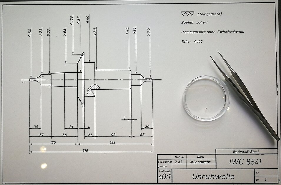 Im Rahmen meiner Meisterprüfung im Jahr 1983 musste unter anderem eine Unruhwelle angefertigt und die entsprechenden technischen Zeichnungen erstellt werden. Das Basiswerk durfte frei gewählt werden und ich entschloss mich aufgrund meiner Sympathie für die Marke, das IWC-Kaliber 8541 zu verwenden.