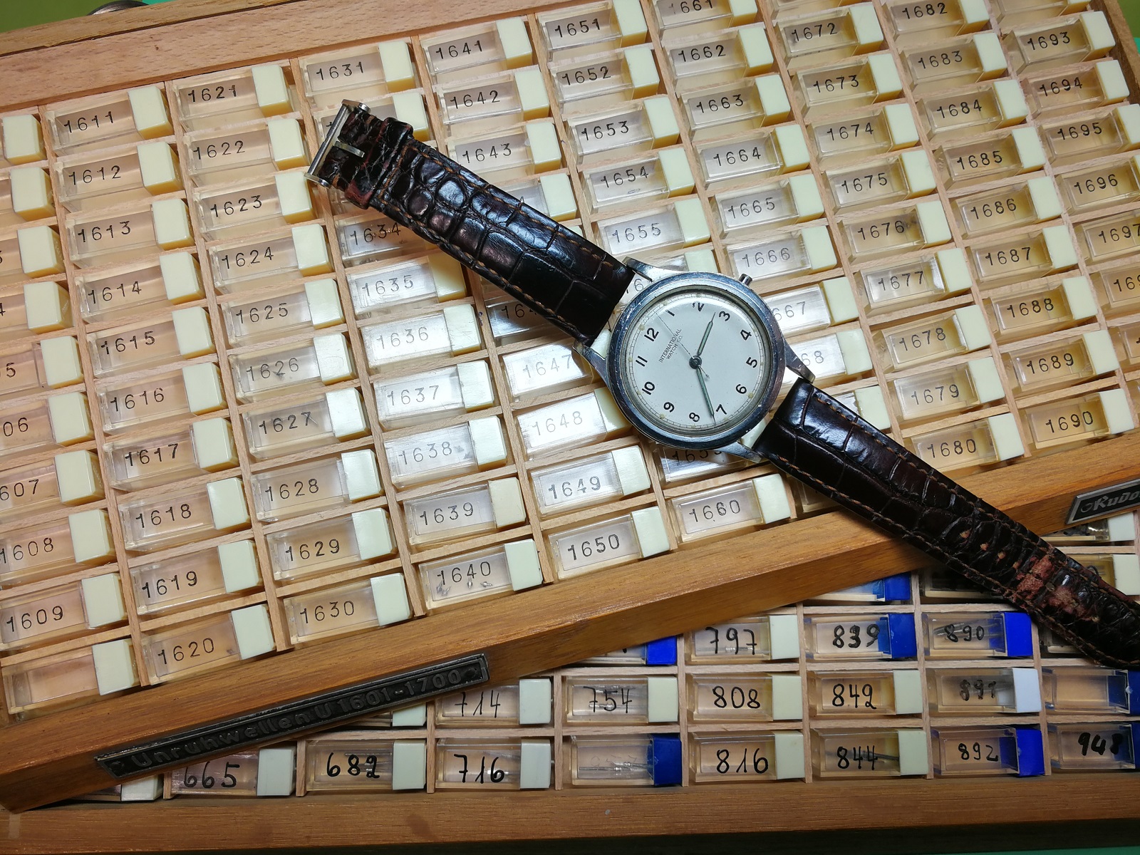 Meine Aufgabe war die Revision des Uhrwerks sowie der Austausch der Unruhwelle, der Aufzugwelle und der Krone. Die Uhr stammt von einem Kunden, der uns seit Jahrzehnten die Treue hält. In dieser Zeit war sie mehrfach bei uns zur Wartung. Im August 1982 führte ich beispielsweise bereits eine Werkrevision mit Ersatz der Unruhwelle durch. Solche Reparaturarbeiten wurden früher oft in Werkstätten auf Flughäfen erledigt. Mein Vater war 1944/45 gelegentlich in der Werkstatt in Köln-Hangelar tätig.