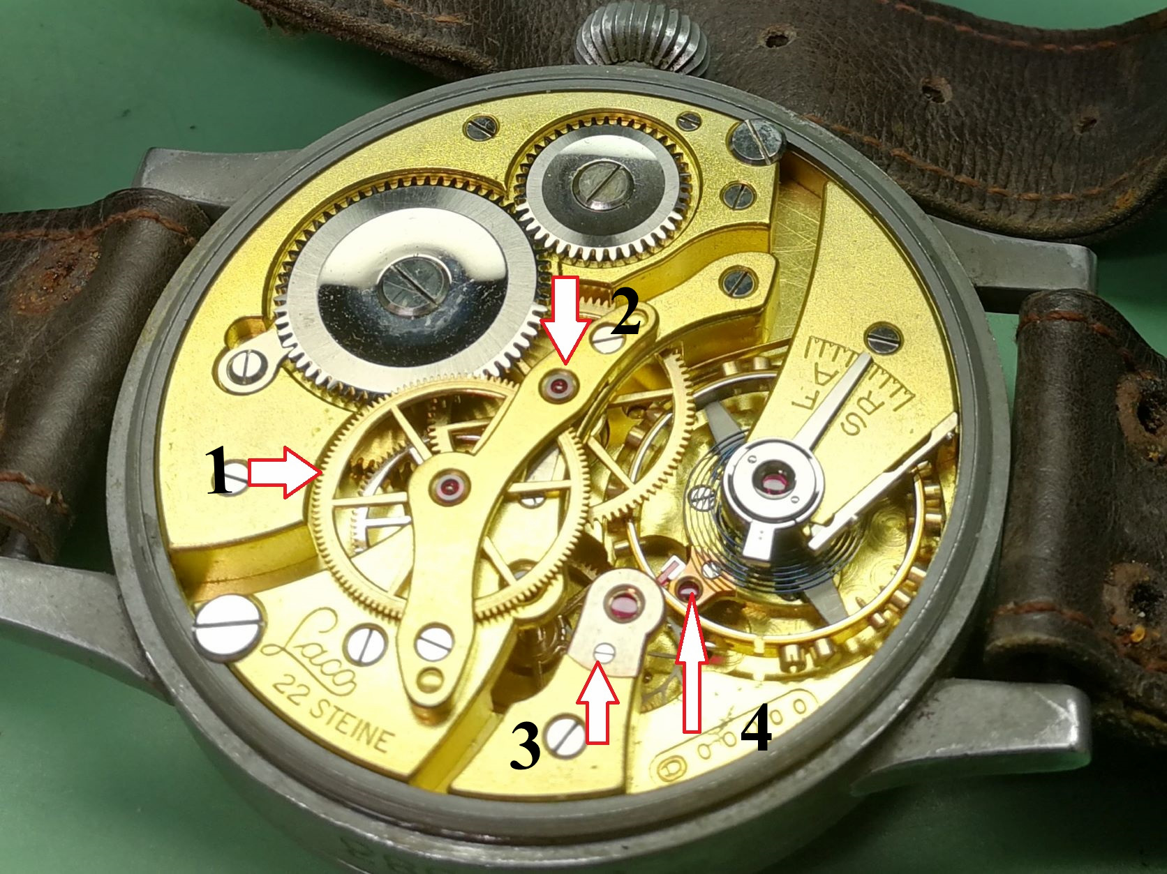 Das hier revisionierte Modell stammt aus der Zeit um 1890 und zeigt auch die hohe Qualität dieser Uhren. Die Platinen wurden durch Hämmern kalt gehärtet, die Stahlteile sorgfältig gehärtet und poliert. Wie beim Beispiel der Laco-Fliegeruhr zeigt sich auch nach langem Einsatz verhältnismäßig geringer Verschleiß. Ausgelaufene Lager und eingelaufenen Zapfen sind eher selten. Im vorliegenden Fall wurden bei einer vorigen Reparatur einige Lager ersetzt. Vermutlich wurde mit einer Revision zu lange gewartet.